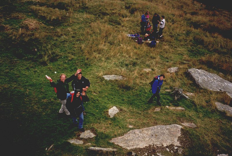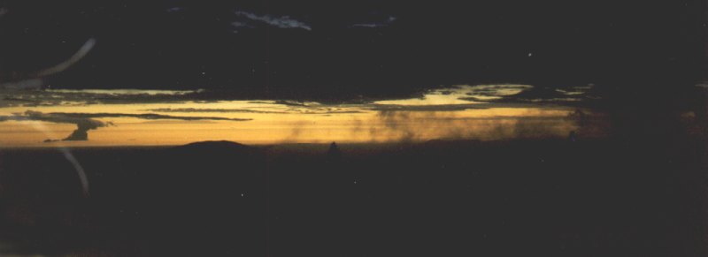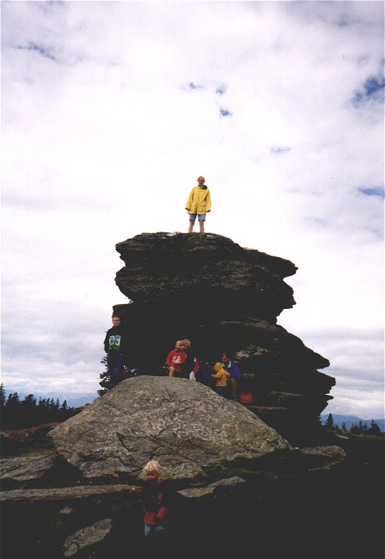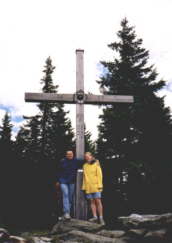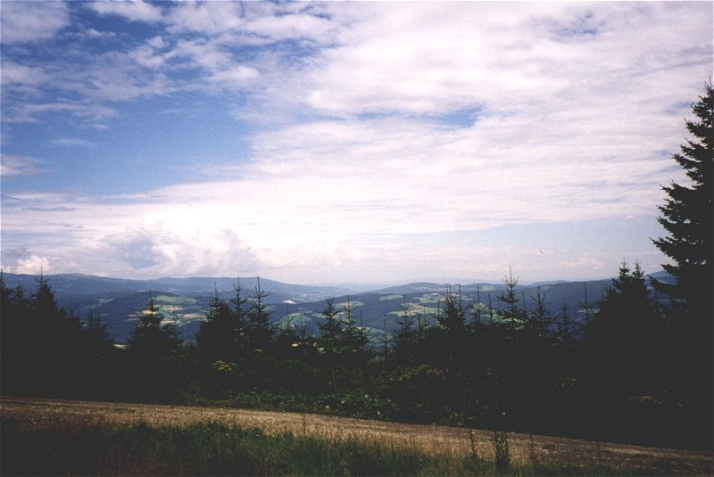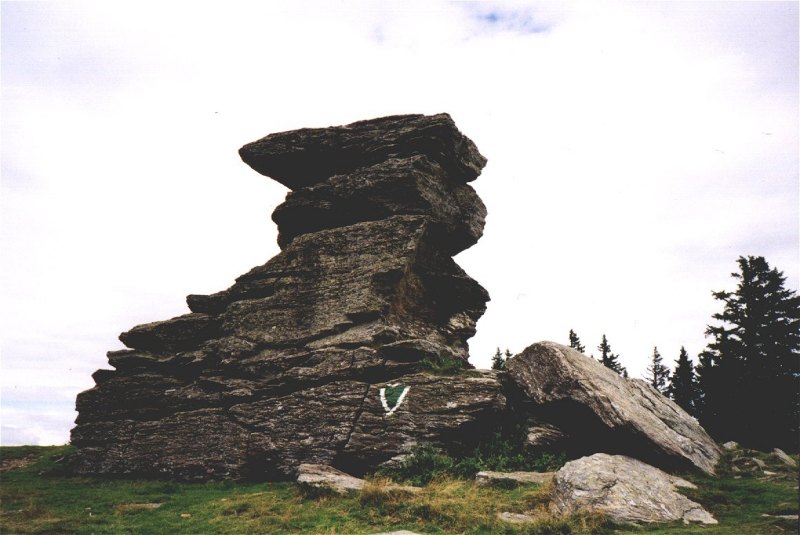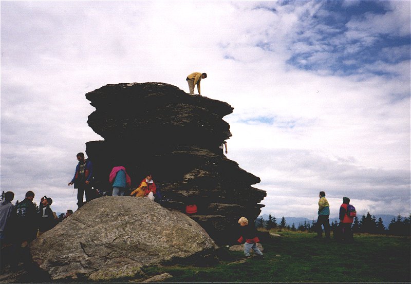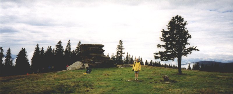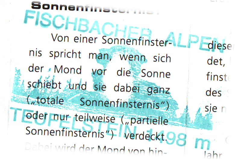 ein Ziel auszuwählen. Dieses Ziel sollte die Gegend um den Teufelsstein, in der Nähe von Fischbach, sein. Schon früh morgens waren wir beim Gasthaus, von dem aus der Weg zum Teufelsstein führte angekommen, und fanden somit noch problemlos einen Parkplatz. Da es bis zum Beginn der Finsternis noch einige Stunden dauern würde beschlossen wir uns in der näheren Umgebung nach einem guten Aussichtspunkt umzusehen. Nach einiger Zeit des Herumwanderns, wir hatten schon einige schöne Aussichtspunkte passiert, kamen wir an einen Felsblock neben dem ein Zelt aufgebaut war. In diesem hauste ein anderer 'SoFi' Beobachter, und der Stein war keineswegs der Teufelsstein sondern nur ein kleinerer Felsbrocken. Einige Meter daneben war das Gipfelkreuz des Teufelssteines. Während ich mir den Stempel in das Begleitheftchen zur SoFi-Brille stempelte, kamen wir mit einigen Wienern ins Gespräch, die hier auf Betriebsausflug waren. Auf der Ebene nebendem Gipfelkreuz war auch der Teufelsstein zu sehen. Einige Leute hatten schon darauf Platz genommen und auch in der Umgebung des Steines hatten sich schon viele Leute eingefunden. Da am Stein noch einige Plätze frei waren setzten wir uns auch hinauf. Da wir geplant hatten noch mal zum Auto zurückzukommen hatten wir die Jause dort gelassen. Bis zum Beginn der Finsternis war noch genug Zeit, weshalb ich mich auf den Weg zurück zum Auto machte. Unterwegs kamen mir dutzende von Leuten entgegen, und ich bekam langsam ein Vorstellung davon wieviele sich insgesamt auf der Ebene um den Teufelsstein versammeln würden. Beim Auto angekommen erkannte ich den Parkplatz kaum wieder. Fast jede freie Fläche war mit Autos zugeparkt. Schnell packte ich die Jause und ein Reservetshirt ein, zog andere Schuhe an und machte mich wieder auf den Weg zum Gipfel. Ich überholte noch einige Wanderer und kam recht bald wieder oben an. Überall standen kleinere und größere Gruppen von Leuten beisammen, die die schon begonnene Verfinsterung der Sonne beobachteten. Judith hatte mir noch einen Platz auf dem, sonst inzwischen schon vollbesetzten, Stein freigehalten. Ich setzte mich auf den Stein und betrachtete ebenfalls das Spektakel am Himmel. Zumindest versuchte ich es, aber leider war nicht viel zu erkennen, da es ziemlich bewölkt war. Die meiste Zeit brauchte man die SoFi-Brille gar nicht, da die Sonne selbst mit freiem Auge nicht zu sehen war. Dafür konnte ich mich mit den anderen am Stein sitzenden Leuten unterhalten. Wenn sich die Sonne mal kurz blicken lies bemerkte man das am lauten Aufstöhnen der versammelten Leute. In solchen Momenten nahm ich die Brille zur Hand, und schaute mir an wieweit sich die Sonne bereits verdunkelt hatte. Irgendwann war dann der große Augenblick da. Die im Westen liegenden Wolken waren schon fast schwarz und wenig später wurde es auch um den Teufelsstein dunkel. Es wurde merklich kühler, da der Wind nach wie vor stark blies, und als ich die Hoffnung die Sonnenkorona zu sehen schon aufgegeben hatte, schob sich ein großes Loch in der Wolkendecke vor die Sonne und den Anwesenden bot sich ein unvergeßliches Erlebnis. Die Korona lies sich in ihrer ganzen Pracht bewundern und auch der Diamantringeffekt am Ende der totalen Verfinsterung war wunderschön zu sehen. Kaum daß es wieder hell geworden war begannen die Leute auch schon in Scharen den Teufelsstein zu verlassen. Judith und ich blieben noch einige Zeit und wir betrachteten vom Stein aus die Völkerwanderung. Dann verließen auch wir den Stein, schauten uns in der näheren Umgebung um und schossen noch einige Photos. Dann machten auch wir uns auf den Rückweg zum Auto. | |